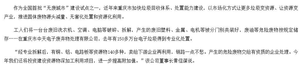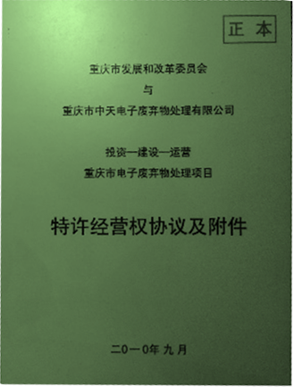 從2010年開(kāi)始,公司就是重慶市政府公開(kāi)招投標(biāo)確定的重慶市電子廢棄物處理特許經(jīng)營(yíng)權(quán)企業(yè),在重慶市“一小時(shí)經(jīng)濟(jì)圈”范圍內(nèi)23個(gè)區(qū)縣,開(kāi)展電子廢棄物綜合回收機(jī)處理處置業(yè)務(wù)。